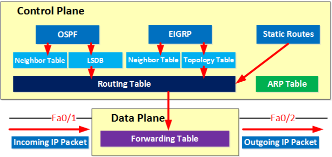 Kontrol düzlemi, yönlendirme tablosunun doldurulmasından, ağ topolojisinin çizilmesinden, tablonun iletilmesinden ve dolayısıyla Veri Düzlemi üzerinde gerçekleştirilecek bütün işlemlerin karar verilmesinden sorumludur. Bu sebeple bir yönlendirme tablosunun oluşma süreci, Kontrol Düzlemi’nin bir parçası olarak kabul edilir.