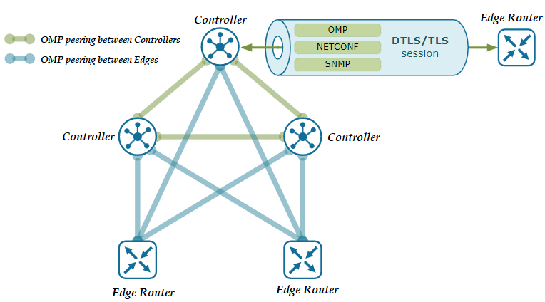 OMP works inside control plane connections via DTLS session and establishes a peering relationship between devices. In the absence of a centrally located controller, OMP will not work between end devices. It works in a structure similar to the “Route-Reflector” structure that works in BGP. Devices connecting with each other perform authentication of each other and establish DTLS or TLS tunnels. Thus, OMP protocol mapping is created on the IP addresses of the connected devices, and the exchange of routing information takes place and helps to extract the network topology. As a result, it works much more efficiently than traditional routing protocols.