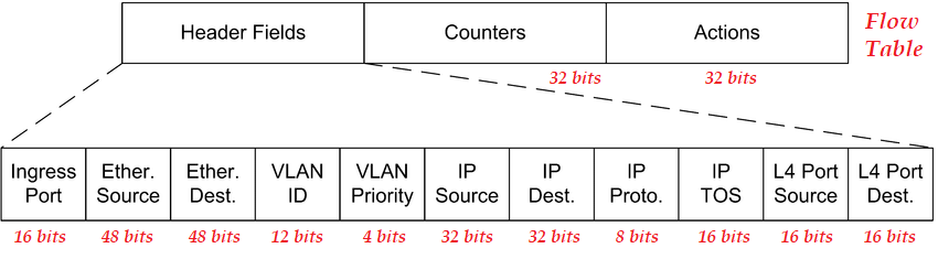 The OpenFlow protocol collects information such as packets received, packets sent, certain changes applied, statistics collected through messages that provide connection and exchange between the devices in which it is used. Routing tables are dynamically forwarded to the end devices by the controller. The controller can control many end devices simultaneously. OpenFlow provides a unique advantage in designing and programming the controller to create different routing tables for different flows. The information and dimensions in the OpenFlow package header are given in the image below.