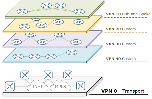 Thus, more than one Overlay design can be created depending on the area where it will be used on an Underlay network. For example, on Overlay, the network can be divided into different network layers, allowing the use of different VPNs. The VPN structures thus established are known only to the Overlay design. Underlay just follows standard IP routing.