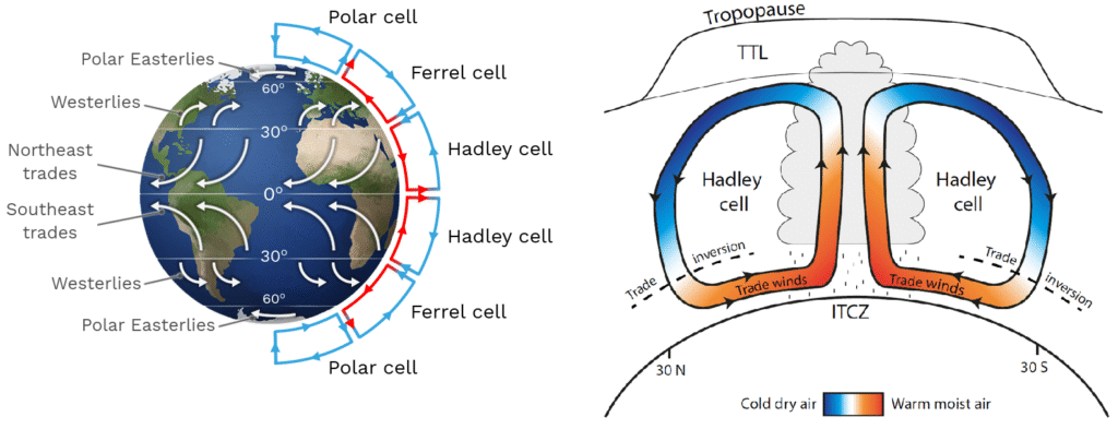 Hadley hücreleri, ekvator bölgesinde yükselen sıcak havanın troposferin üst katmanlarına doğru hareket etmesi, yaklaşık 30° enlemlerde soğuyarak alçalması ve tekrar ekvatora dönmesiyle oluşan büyük ölçekli atmosferik dolaşım sistemleridir.Bu hücreler, rüzgarların ve iklim kuşaklarının oluşumunda temel bir rol oynar. Ekvator üzerinde yükselen nemli hava yoğunlaşarak yağmur oluşturur, 30° enlemlerde alçalan hava ise kuraklık ve çölleşme ile sonuçlanır. Hadley hücreleri, atmosferin ısı dengesini sağlar ve ekvator ile orta kuşaklar arasındaki rüzgar kuşaklarını belirler. Coriolis kuvveti ile birleştiğinde, tropikal ticaret rüzgarları ve batı rüzgarları gibi küresel rüzgar sistemleri ortaya çıkar.
